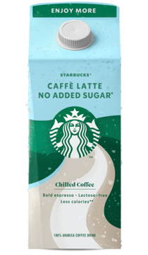 Starbucks® Multiserve Caffè Latte No Added Sugar: Eine gekühlte Mischung aus intensivem Espresso und laktosefreier Milch* ohne Zuckerzusatz, jetzt für zu Hause. Der gleiche grossartige Geschmack – in einer grösseren Verpackung für mehr Kaffeemomente.