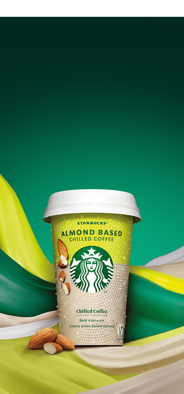 Starbucks® Almond Based IJskoffie: Een gekoelde blend van stevige espresso en romige plantaardige amandelmelk. De smaak blijft dezelfde: een heerlijk frisse opkikker voor thuis of onderweg.